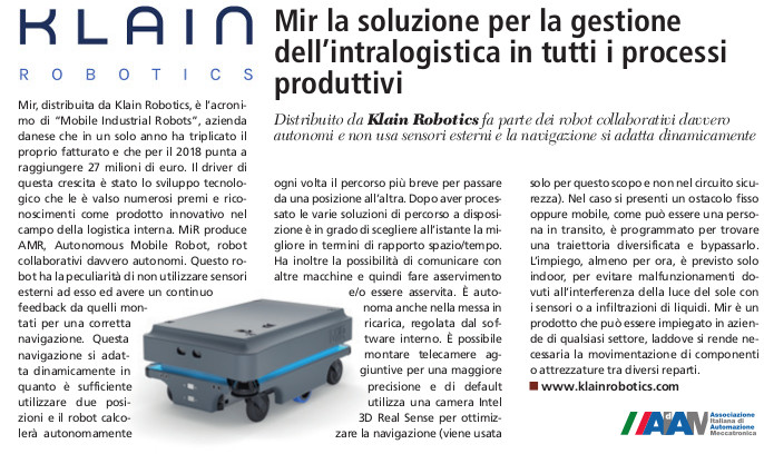 Mir, distribuita da Klain Robotics, è l’acronimo di “Mobile Industrial Robots”, azienda danese che in un solo anno ha triplicato il proprio fatturato e che per il 2018 punta a raggiungere 27 milioni di euro. Il driver di questa crescita è stato lo sviluppo tecnologico che le è valso numerosi premi e riconoscimenti come prodotto innovativo nel campo della logistica interna. MiR produce AMR, Autonomous Mobile Robot, robot collaborativi davvero autonomi. Questo robot ha la peculiarità di non utilizzare sensori esterni ad esso ed avere un continuo feedback da quelli montati per una corretta navigazione. Questa navigazione si adatta dinamicamente in quanto è sufficiente utilizzare due posizioni e il robot calcolerà autonomamente
