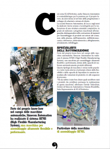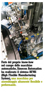 fosse certamente la più adatta per il progetto di Simecon Automation. Cuore della macchina di assemblaggio HFMS sono il robot della gamma DENSO, serie VS6556, e il sistema di alimentazione flessibile della serie Eyefeeder 1000, entrambi forniti da KLAINrobotics. Il robot della DENSO VS6556, con sbraccio da 653mm e payload di 7 kg, e il sistema di alimentazione flessibile Eyefeeder 1000, il più grande tra i modelli proposti dal brand olandese Roba Engineering, sono coordinati da un sistema di visione guida robot, con programmazione del cambio di modello molto rapido e semplice, per adattarsi al meglio a ogni tipo di produzione. La macchina di assemblaggio HFMS conta una serie di stazioni di lavoro, alimentate da una innovativa linea a pallet ad assi lineari, che consente il passaggio dei pezzi tra le varie stazioni in tempi molto brevi, grazie all’elevata velocità con cui si muove e permette di effettuare multiposizioni sotto la stessa stazione e/o tra i vari modelli da processare.